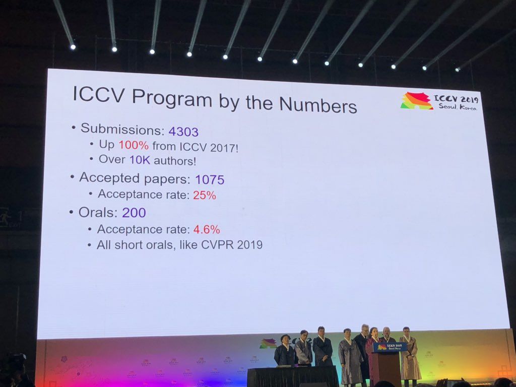 而在论文方面,ICCV 2019 共收到 4303 篇论文,是上一届大会 ICCV 2017 论文投稿数量(2143)的 2 倍以上。最终大会接收了 1075 篇论文,接收率为 25.02%,其中 200 篇为 oral 论文(4.6% 接收率)。