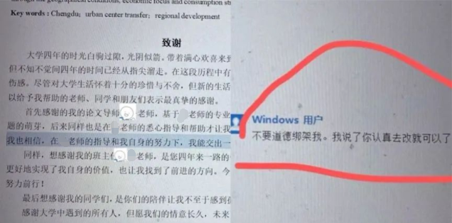 女生在致谢部分写了对论文指导导师的感谢,并称「相信在老师的指导和自身努力下,自己将会交出满意的毕业答卷」,导师很感动并进行了批注「不要道德绑架我,我说了你认真去改就可以了」。
