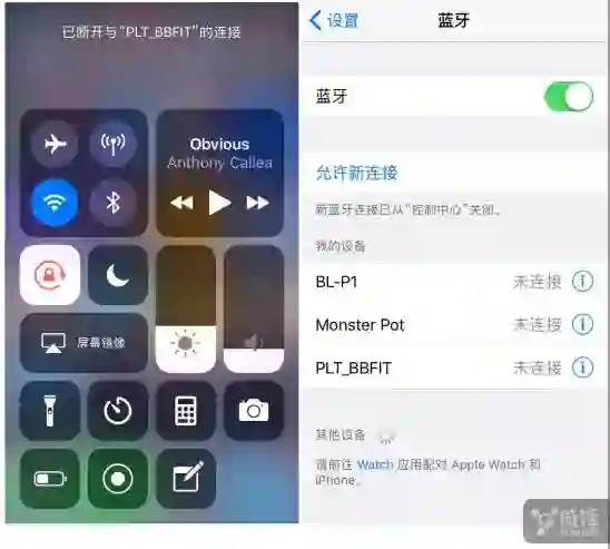 在控制中心关闭蓝牙按键的时候,控制中心面板顶部会出现“已断开与‘(蓝牙设备名称)’的连接”字样,提示用户已经与当前连接的无线网络断开连接,然而进入设置应用的蓝牙面板,蓝牙的开关保持打开的状态。不过面板里多出了一个选项“允许新连接”(其下方也有小字提示:新蓝牙连接已从“控制中心”关闭),点击该选项即可进入寻找及连接蓝牙设备的界面,其控制中心的蓝牙开关也会被打开。