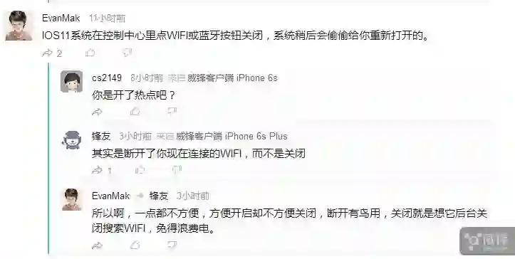 苹果的这个变化引起了多方讨论,而与之有最直接关系的苹果用户也非常关心这个变化。有的用户表示,自己关闭Wi-Fi和蓝牙就是为了省电,可是苹果现在重新设计之后,除非用户自己进入设置应用的相应面板中关闭Wi-Fi或者蓝牙,不然的话只在控制中心关闭这些开关根本起不到省电的作用。在这些用户看来,苹果这个新设计让他们的体验变得更复杂了。