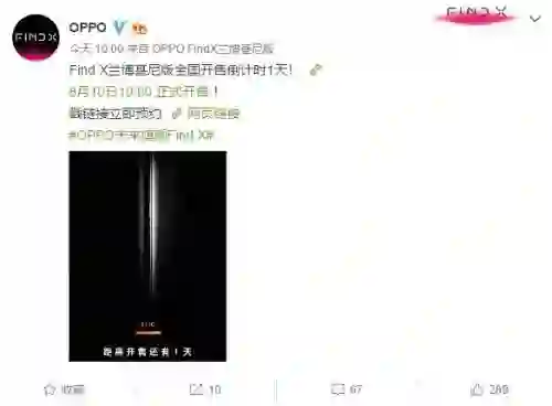 最后,OPPO手机官微预告,Find X兰博基尼版将于明天早上(8月10日)10点正式开卖,售价9999元。如果喜欢这款产品,可以去官网抢购。