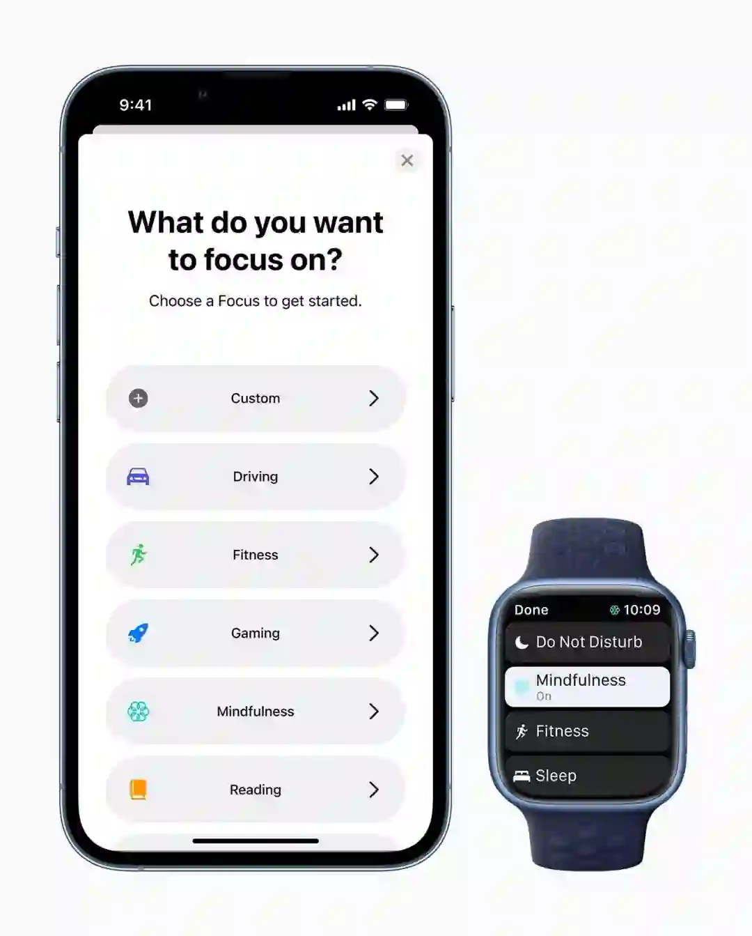专注模式提供新的方式帮助用户减少分心:会根据用户正在做的事筛选展示来自其他人或 app 的通知。Apple Watch 会自动与 iOS、iPadOS 或 macOS 上设置的专注模式同步。用户可设置自动化操作,在相关时间开启专注模式,比如在开始训练时开启健身专注模式。