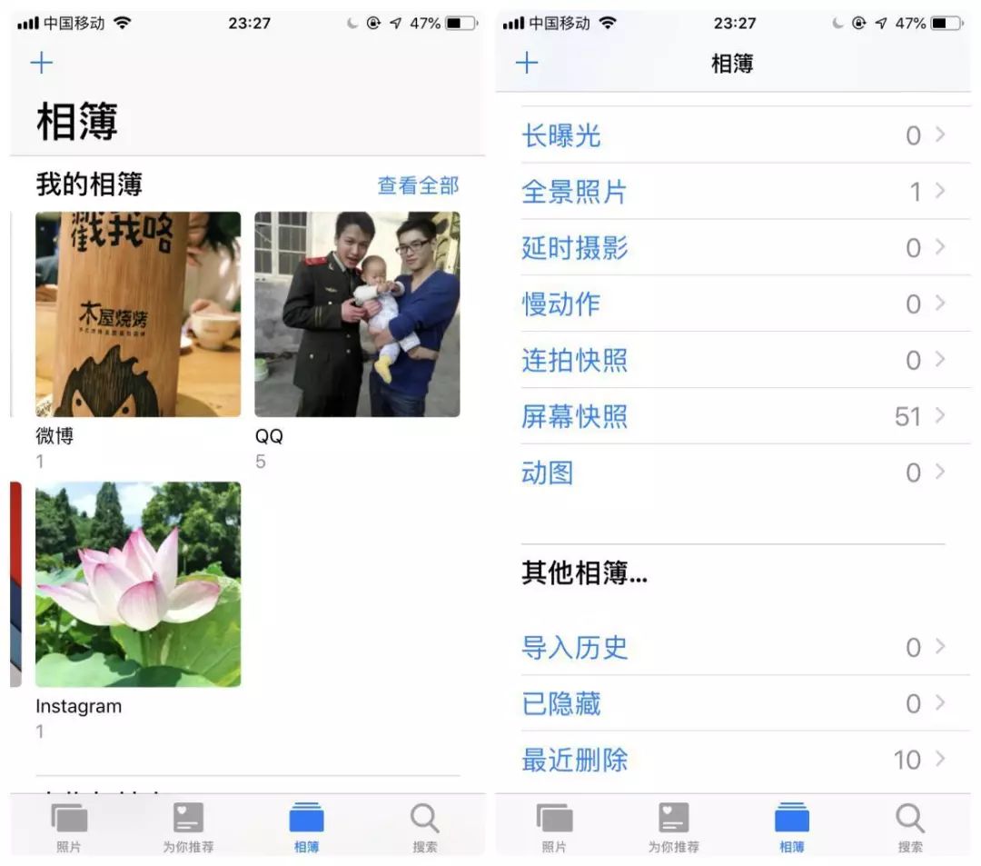 不同类型的照片分类也有了更详细的分类和标签,其中「最近删除」也被移到了最底部,不再与其他相册一同展示。