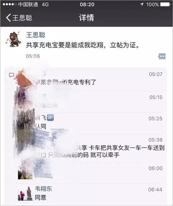 2017年5月5日,就在网间传出聚美优品投资街电3亿元的消息后,王健林之子王思聪当日凌晨5点发出一条微信朋友圈,如此揶揄:“共享充电宝要是能成,我吃翔。立帖为证。”