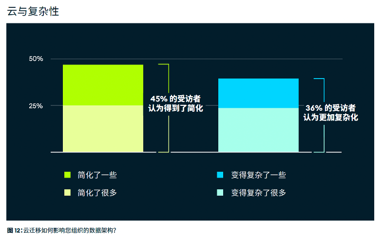 前文的调查报告还提到一点,45% 的受访者表示,迁移到云端有助于简化其数据架构,而 36% 的受访者则表示,上云实际使其数据架构变得更加复杂。上云到底是简化数据架构还是增加复杂性,不同企业有截然不同的体验,这背后的原因值得探究。