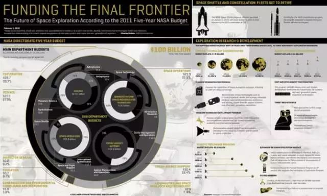 上述图表相对简单,以下是创造设计精致的、传递大量数据的图标方法。秘诀何在?用简单的和干净的格式,便于读者理解数据。这个由GOOD Magazine 和 Column Five制作的图表,解读了NASA的五年预算,显示资金将怎么花、花在哪里。此外,它有主题设计-一个全方位的胜利。