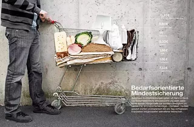 不是所有的数据可视化都需要用动画的形式来表达。当现实世界的数据通过现实生活中的例子进行可视化,结果会令人惊叹。设计师Marion Luttenberger把包含在Kontakladen慈善年报中的数据以一种独特的方法表现出来。该组织为奥地利的吸毒者提供支持,所以Luttenberger的使命就是通过真实的视觉来宣传。例如,这辆购物车形象的表现了受助者每一天可以负担得起多少生活必需品。