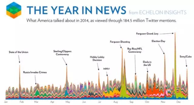最好的数据可视化方式,就是用直观和美丽的方式传达信息。Echelon Insights致力于这一方式,即将2014年Twitter上最受关注的新闻进行可视化。1亿8450万条推文是什么样子?如图所示的艺术品。
