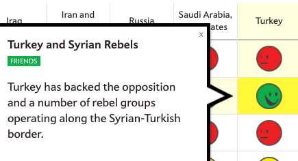 许多不同的团体之间的关系可能很难理解 – 尤其是当有11个这样的团体存在的时候,这些团体之间有的结盟,有的敌对,反之亦然。这让人难以理解。但是,Slate网站通过表格的形式和熟悉的视觉效果和色彩,将这些数据简化为一种简单的、易于理解和互动的形式。