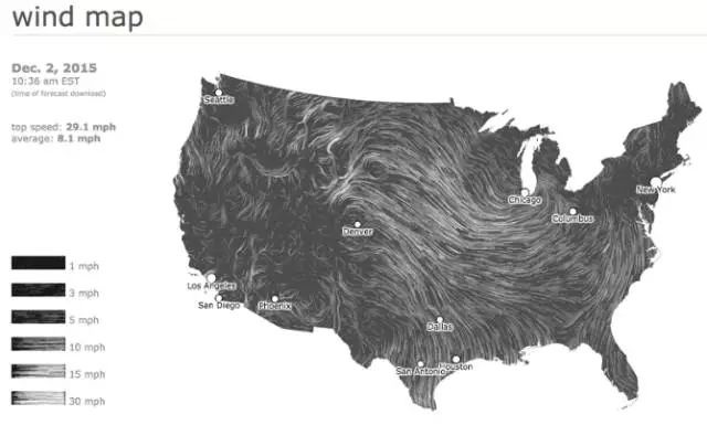 下面是是个类似感恩节航班的可视化图,除了图中显示的时刻,它还能实时显示美国本土的风速和风向。它是直观设计的一个很好的案例:风速用线条移动的快慢来表示,方向通过线条移动的路径来表示。它会即时显示美国风向的总体趋势,无需任何数字,除非你在地图上点击鼠标。另外,使用时设定最多两个变量会使它更容易操作。