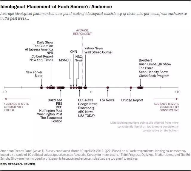 据Pew研究中心称,通常,当设计师在信息内容很多又不能删节的时候,他们通常会把信息放到数据表中,以使其更紧凑。但是,他们使用分布图来代替。为什么呢?因为分布图可以让观众在频谱上看到每个媒体的渠道。在分布图上,每个媒体的渠道之间的距离尤为显著。如果这些点仅仅是在表中列出,观众无法看到每个渠道之间的比较。