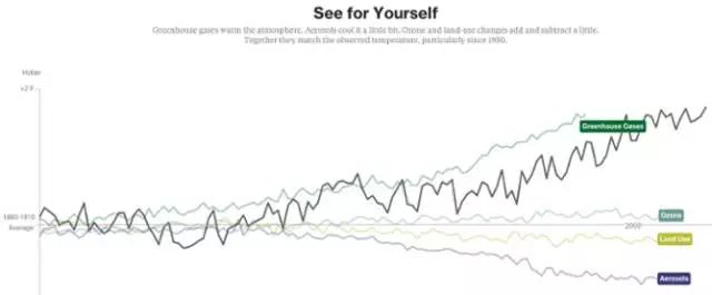 此图的关键点是要反驳用自然原因解释全球变暖的理论。首先你会看到从1880年至今观测到的温度上升。当你向下滚动,这个可视化图会让你清楚的了解相较于已被观测到的因素,造成全球变暖的不同因素到底有多少,使故事内容更加丰富。作者希望观众能够得到非常清晰的结论。