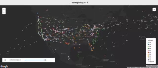 下面是将一段时间内在空中移动的物体进行可视化的好方法。这是由Google Trends驱动的项目,它跟踪感恩节前出发、到达和穿越美国的航班。可视化始于当天很早的时间,随着时间的推移,像播放电影一样显示在全国各地飞行中的航班。不需要显示时间外的任何数字,观众即可以看到当天哪段时间是国际航班、国内航班以及往返于全国各地不同枢纽的航班的热门时间。
