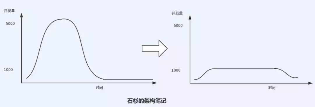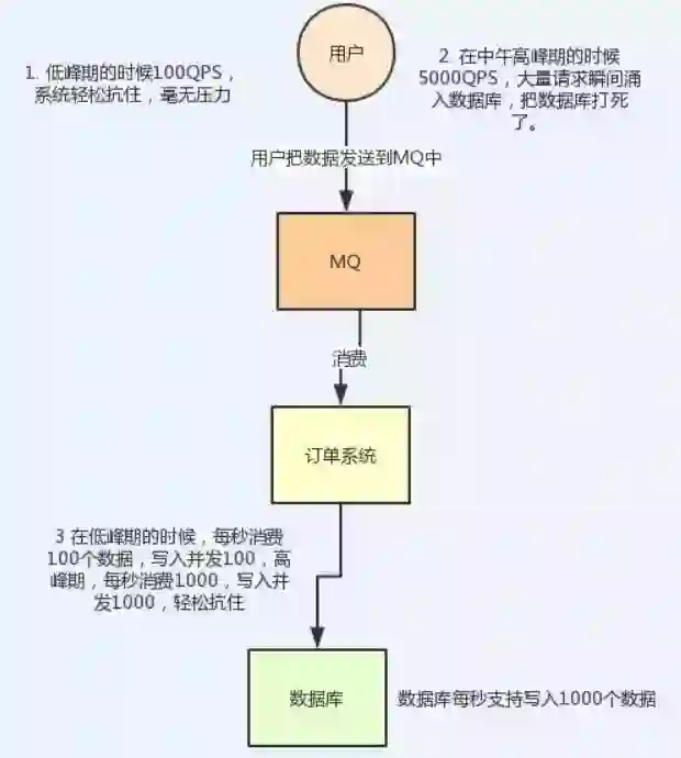 但是使用了MQ之后,限制消费消息的速度为1000,但是这样一来,高峰期产生的数据势必会被积压在MQ中,高峰就被“削”掉了。