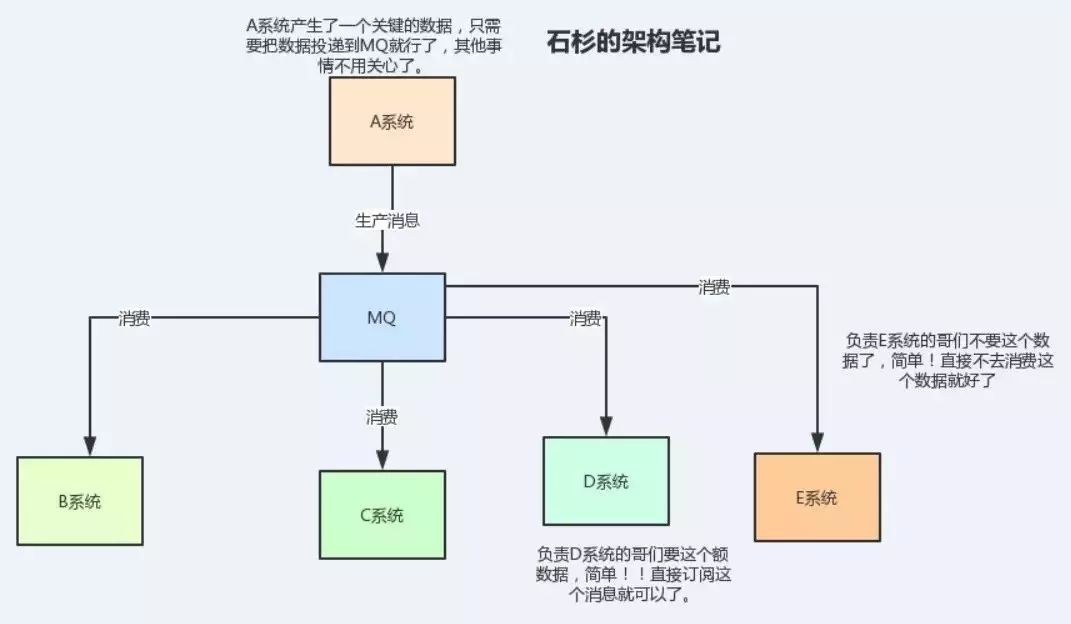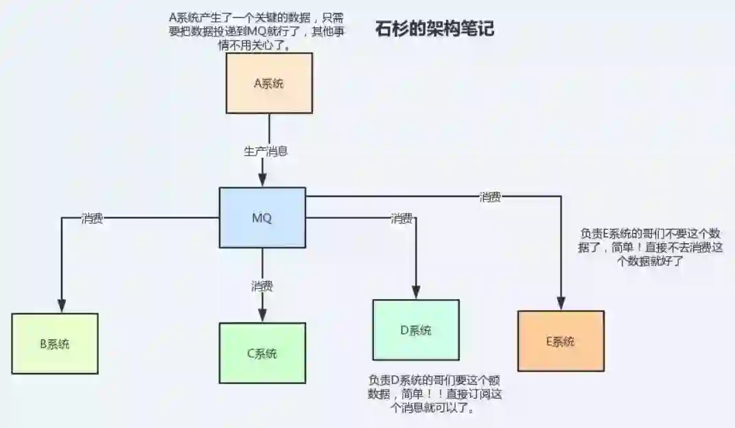 大家想想一下,上面的说解耦的场景,本来A系统的哥们要把系统关键数据发送给BC系统的,现在突然加入了一个MQ了,现在BC系统接收数据要通过MQ来接收。