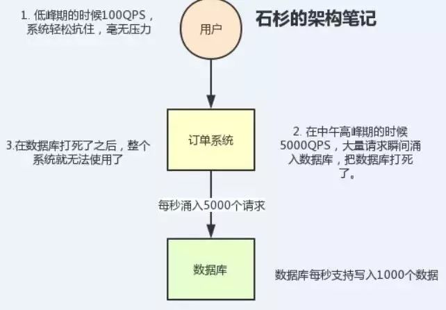 举个例子,比如我们的订单系统,在下单的时候就会往数据库写数据。但是数据库只能支撑每秒1000左右的并发写入,并发量再高就容易宕机。
