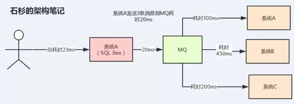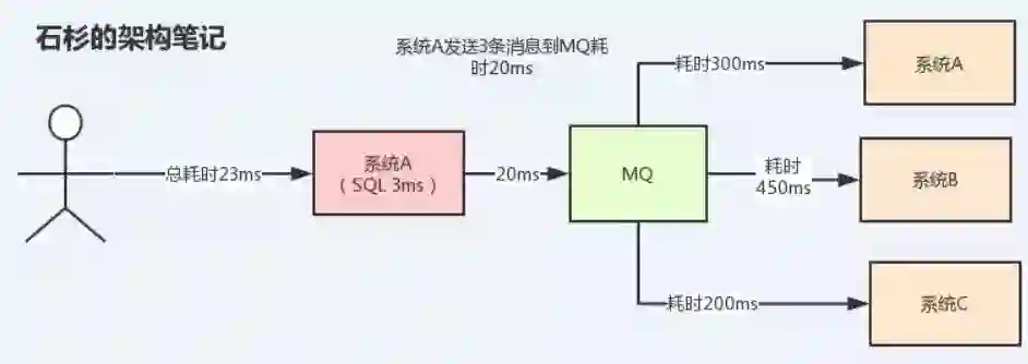 假设发送消息到MQ中耗时20ms,那么用户感知到这个接口的耗时仅仅是20 + 3 = 23ms,用户几乎无感知,倍儿爽!