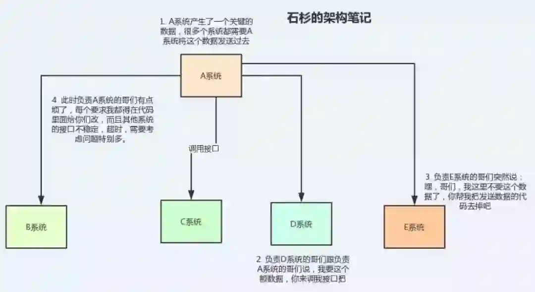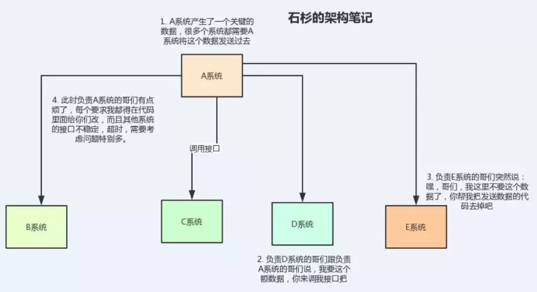 并且有时候可能B系统突然又不要这个数据了,A系统该来改去,A系统的开发哥们头皮发麻。