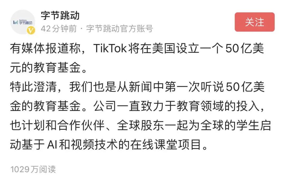 随后,字节跳动官方否认了50亿美元教育基金的传闻。