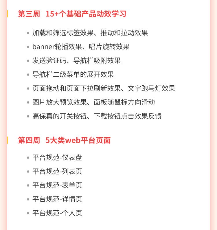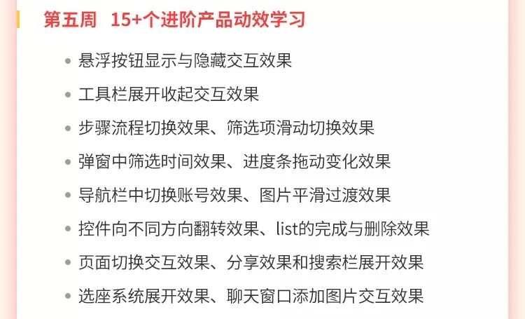 在前2周功能基础掌握的情况下,你会系统学习到web端、手机端的产品交互动效,进阶学习切换、拖动、平滑等15+个进阶效果