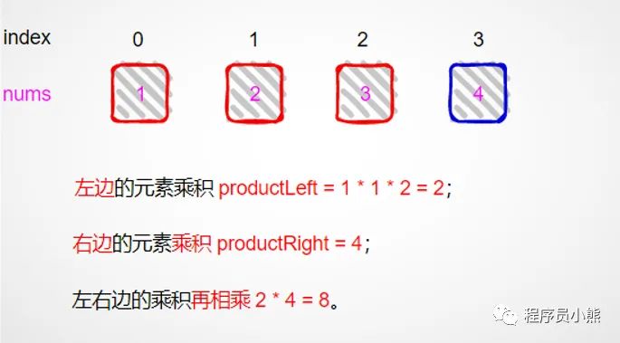 所以除下标为 2 以外的元素的积为左侧乘积 * 右侧乘积。