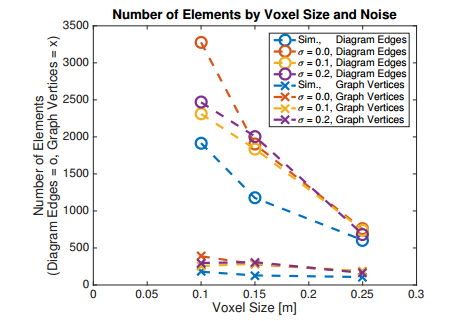 图 7 骨架图(圆圈)和稀疏图(十字)中元素数量的比较。可以看出,体素大小和较小程度的噪声水平对图中元素的数量有很大影响,但图形大小基本保持不变。这意味着图形大小是空间拓扑的函数,而不是地图的分辨率或质量。