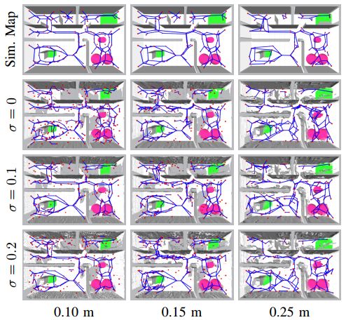 图 6 比较在相同仿真环境中,在不同体素大小和距离测量中的噪声量下生成的稀疏图。第一行是根据地面实际ESDF数据仿真的,而另外三行则显示了使用噪声深度传感器从200个模拟无人机姿势创建的地图。可以看出,尽管由噪声或离散化误差引入了外来边缘,但图的核心结构保持不变。生成的图表最小距离为0.4米。