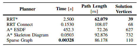 表 1 通过迷宫进行规划的定量结果,如图8所示。我们的方法(稀疏图)比RRT *的初始解决方案快800倍,甚至比RRT Connect快50倍。它产生稍长的路径,因为它绑定到最大间隙图。
