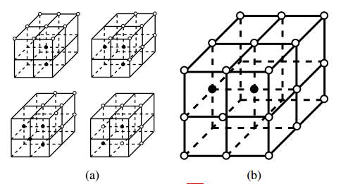 我们采用Lee等人描述的一般方法,该方法还允许并行的细化操作。首先,根据几个删除模板之一检查形状中的所有体素。我们选择使用She等人的模式,因为它们简单并且不需要超过每个体素的3×3邻域,如图4(a)所示。根据这些模板评估中心体素的邻域。在模板中,点可以是前景(黑色,边或顶点邻居),背景(白色,面或非GVD邻居),或“不关心”(未标记)。“不关心”点可以匹配任何一个值。
