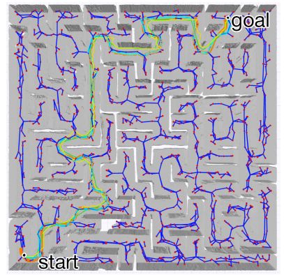 最终的加速是遍历稀疏图而不是底层图,因为无论体素大小或噪声水平如何,图都保持大致相同的大小。我们通过在预先构建的K-D树结构中搜索最近邻居来找到最接近起点和终点的稀疏图顶点。然后我们使用A *来遍历目标顶点的边缘。