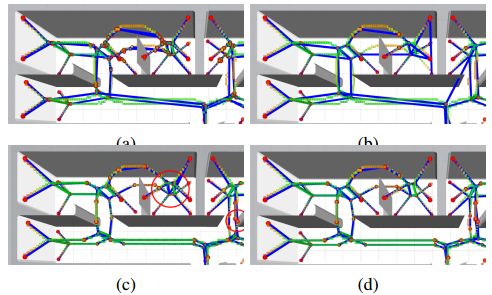 图 5 顶点生成过程中的步骤,红色圆作为稀疏图的顶点,蓝色连接线为稀疏图的边,覆盖在GVD边缘的顶部。(a)显示连接的稀疏图,没有任何顶点修剪。(b)显示k-D树修剪的结果; 可以看出,一些边缘穿过障碍物。(c)显示通过插入新顶点在任何时候偏离直线太远时分割边缘的结果,(d)显示分割也试图匹配到附近顶点的结果(删除(c)中所有顶点附件的重复)。