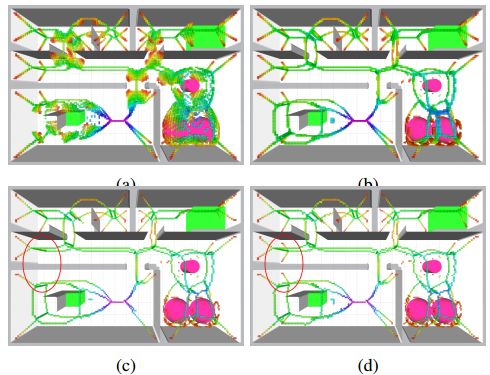 图 3 生成中轴/ GVD边缘的不同方法。(a)显示通过计算基点数生成的边缘,(b)显示由同样位于中轴线上的相邻点数量生成的边,(c)显示使用拓扑保持腐蚀技术稀释的(b)边缘, 最后(d)显示应用相同的技术,但没有扩展的终点检查,特别注意保留在红色圆圈中的边缘。颜色表示到障碍物的距离。