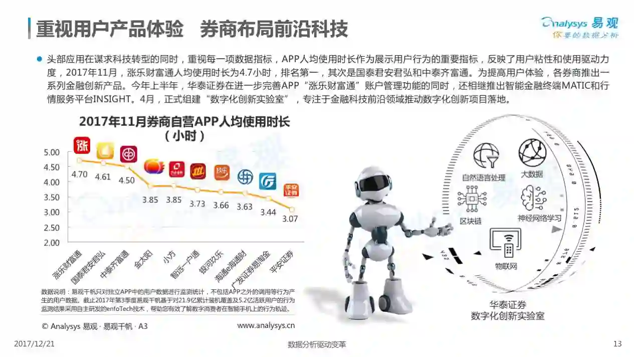 证券类APP已成为连接券商与用户的重要接口,目前,超过95%的开户都在移动端进行,移动端证券成交量占总成交量超过30%,证券类APP已成为投资者不可或缺的应用。然而,经历过高速发展之后,市场已没有由PC端向移动端转移的红利,移动应用同质化严重,头部应用正在谋求科技转型。未来证券类移动应用之间技术壁垒将提高,同业难以复制,广大投资者将从券商科技转型中获益。