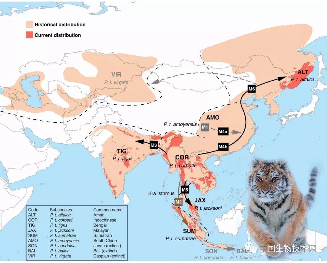 解决这些争议的关键在于全基因组的信息。为了深入了解虎的演化史以及其遗传多样性格局,本研究选取了32份确定地理来源的样本进行了平均覆盖深度为十倍的全基因组测序,共找到约180万个多态性位点。结果表明虎作为物种历史已经有2-3百万年,然而现代虎的基因组多态性水平较低,最近共同祖先仅可回溯至距今约11万年前,这说明虎在晚更新世时曾经经历过至少一次种群瓶颈时期。尽管如此,系统发生学和种群遗传结构分析证明了虎的地域种群之间存在明显的遗传差异,历史性隔离较深,基因交流程度低,支持将现存野生虎种群划分为6个独立的亚种,亦即苏门答腊虎,孟加拉虎,印支虎,马来虎,东北虎和华南虎。晚更新世的冰期动态、苏门答腊岛上的多巴超级火山爆发,以及晚更新世时气候的往复波动可能是导致历次种群分歧并促使虎亚种形成如今的地理分布格局的主要因素。