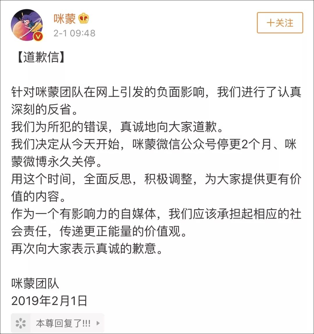 除了道歉,咪蒙团队还自己进行了账号“关停”。咪蒙团队称,“我们决定从今天开始,咪蒙微信公众号停更2个月、咪蒙微博永久关停。”其表示,将用这个时间,全面反思,积极调整,为大家提供更有价值的内容。