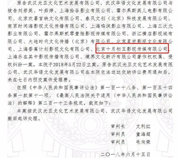 在一份武汉光亚文化艺术发展有限公司、武汉华语文化发展有限公司等与刘若英等著作权权属、侵权纠纷一审民事裁定书中,北京十月初五影视传媒有限公司为被告之一,该案于2018年5月22日立案,2018年6月15日,案件按原告撤回起诉处理。