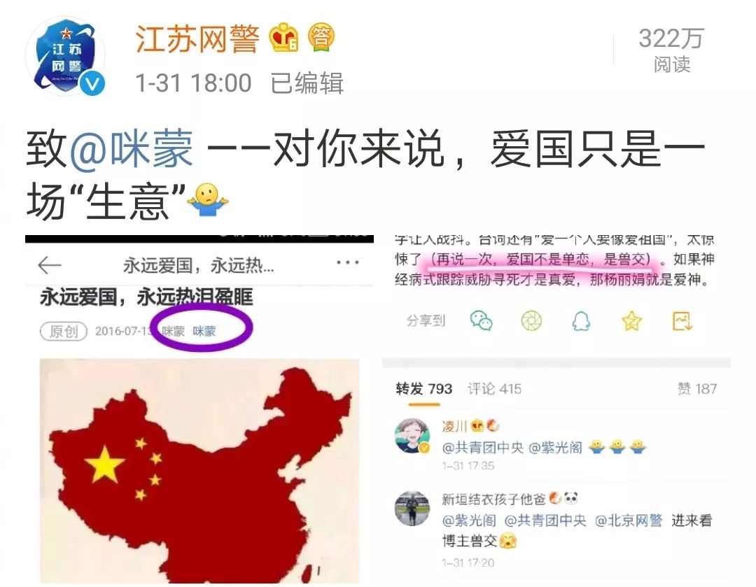 昨晚,@江苏网警直接点名咪蒙,前者批评其将爱国当做“生意”。