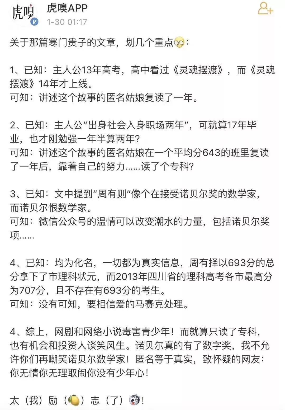 随着文章越来越受关注,对文章内容真实性和价值观的反思越来越多,虎嗅APP提出了几点bug引发广泛认同。