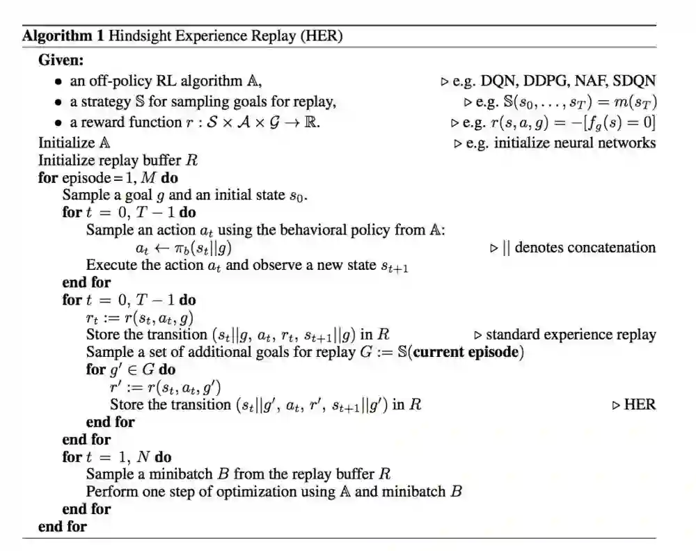本文将介绍一种修改目标,使有效回报数量变多的方法。该方法称简称HER (paper地址):https://arxiv.org/abs/1707.01495v1。