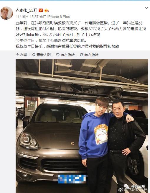 成功后的卢本伟在直播和微博中也一直是保持当年的风格,其作风也让粉丝为之动容。比如上个月送了一台车给女友父亲一台车。