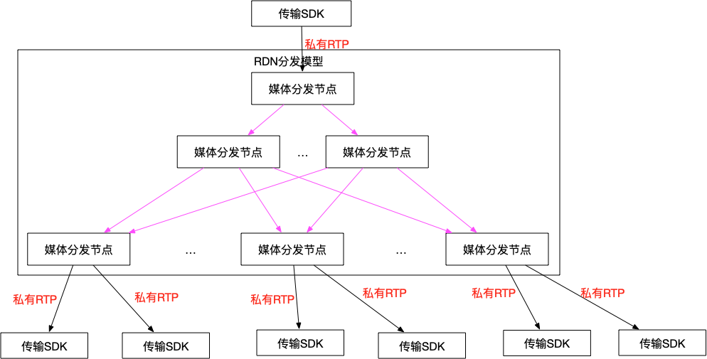 传统的CDN、视频会议系统可以自行查看网上的方案,RDN系统是一个融合CDN架构,并以视频会议媒体服务器为节点的系统。RDN在进行媒体传输采用懒加载的方式进行,当主播把流传输至接收的边缘节点,此时如果有观众播放流,会通过GSLB返回最近的边缘节点并进行资源的索引把流快速的下发至播放侧的传输SDK。媒体流的分发示意图如下: