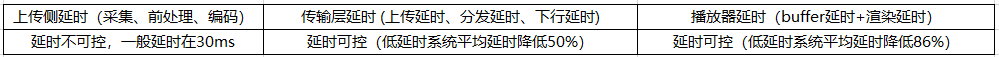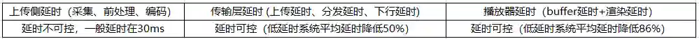 从上图我们可以看出来,可控的唯二也就是传输层、播放器buffer两部分了。在低延时项目中RDN系统控制了整个传输过程,优化了每一个细节,把延时降至118ms以内,低延时播放器自适应动态控制buffer大小、严格控制音视频加减速,保证流畅率的基础上又使延时在415ms以内。通过控制播放侧目标延时实现流畅优先、延时优先两种策略,满足主播连麦互动、粉丝互动两种业务场景。