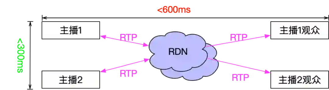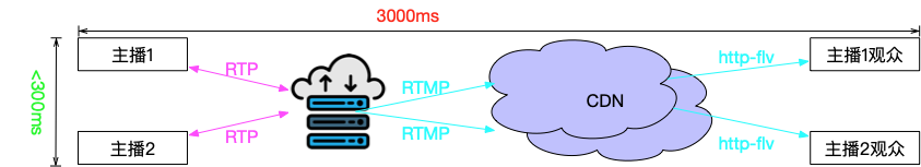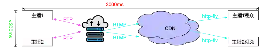 传统直播解决方案中主播之间以实时通信的方式传输延时小于300ms,但是主播与观众之间通过链路传输、CDN分发整个延时往往在3000ms左右,如下图: