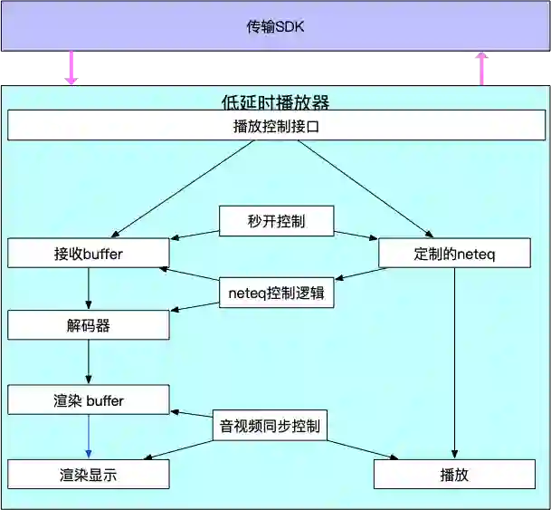 低延时播放器是系统中延时控制的重要环节,是系统中唯一延时可控且可调的部分。相比于传统播放器功能既要满足流畅率、秒开率、音画同步等用户指标,又要保证延时足够低。低延时播放器架构图: