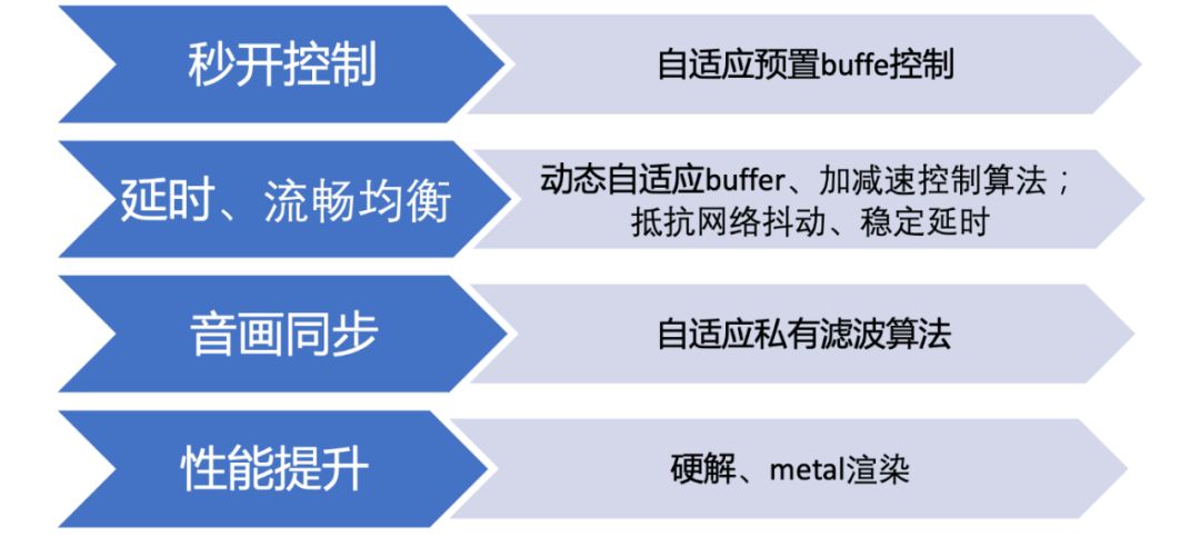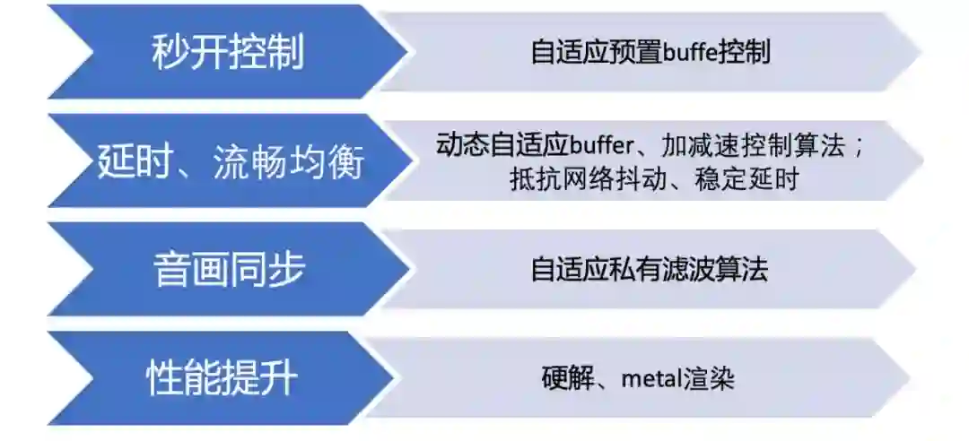 低延时播放器通过定制优化后的neteq,抵抗网络的抖动、丢包等问题,显著提升弱网情况下的用户体验,通过滤波后的音画同步方案,保证在音视频快速加减速同时又能保证用户的体验。