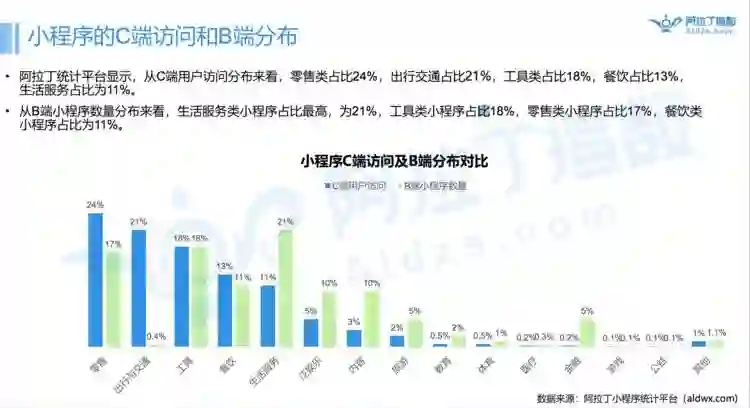 另一个值得注意的点在于,从 C 端用户访问分布来看,零售类占比最高,达到了 24%,出行交通占比 21%,工具类占比 18%,餐饮占比 13%,生活服务为 11%。同时因为双十一的催化,在最近两个月的增长速度最快的 Top30 榜单中,零售更是入选 13 个小程序,独占鳌头。