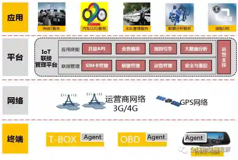 车联网解决方案支持面向前装市场和后装市场,由车载终端、无线网络接入、OceanConnect IoT平台和业务应用几部分组成。OceanConnect IoT平台作为关键平台层,起到承上启下的作用。