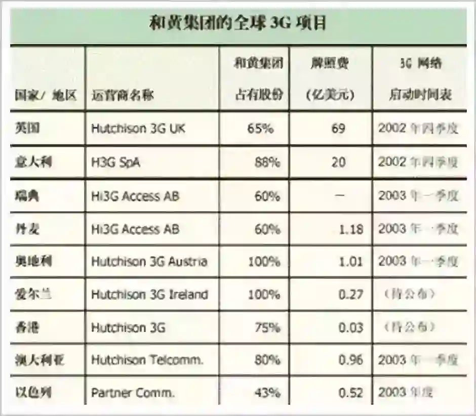 此后两年,和黄绕开德国,接连拿下了意大利、奥地利、瑞典、丹麦和爱尔兰的3G牌照,前后花费近250亿美元。