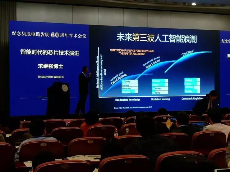 但现在我们通过深度学习,只是把系统的感知能力和学习能力提升到比较高的水平,而抽象能力和推理能力甚至还不如上一阶段。DARPA曲线的第三阶段实际上要解决的是如何整合这四方面的能力,通过硬件支撑起这样一套智能系统。