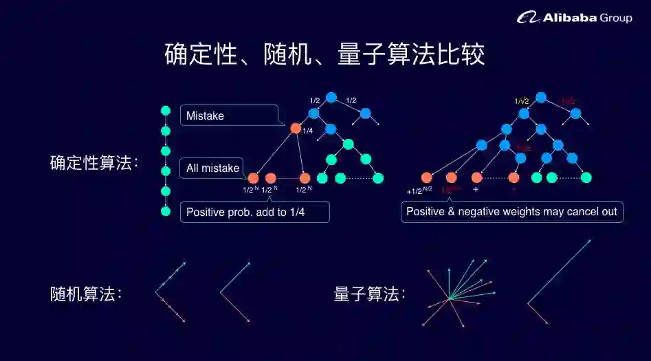 量子算法跟随机算法很像,它可以有很多不同路径,但最后的节点的权重可以是正可以是负,正+负可以是0. 图中红色的向量对应错误的基向量。他们量叠加起来信号反而很小,互相取消,而绿色的的出正确结果的向量叠加起来信号互相加强。